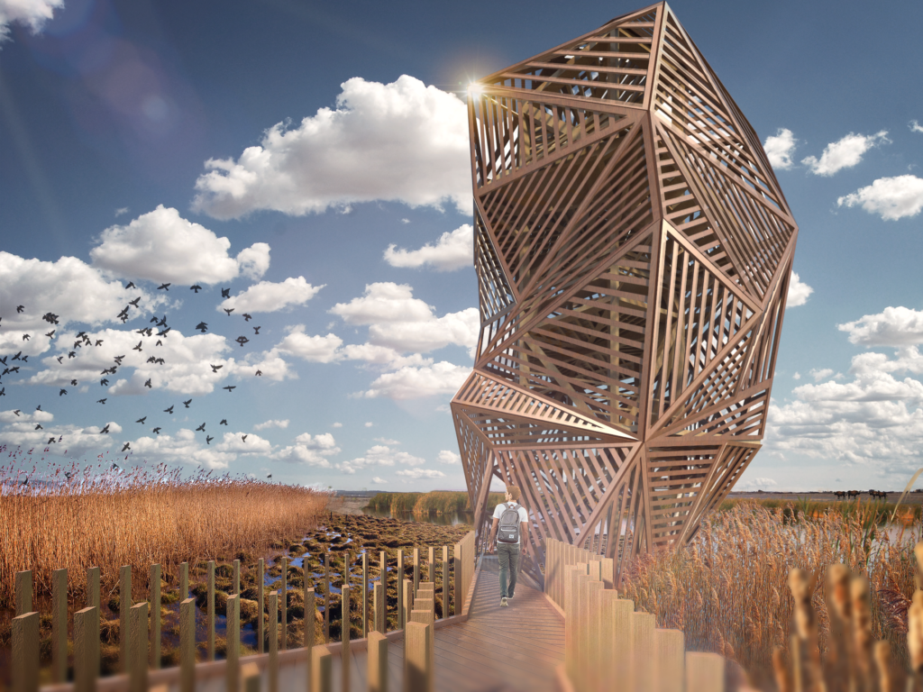 Cet observatoire, dont le but est de surveiller les quelques 274 espèces d’oiseaux et autres espèces animales qui habitent la zone humide doit s’insérer de façon respectueuse avec son environnement.