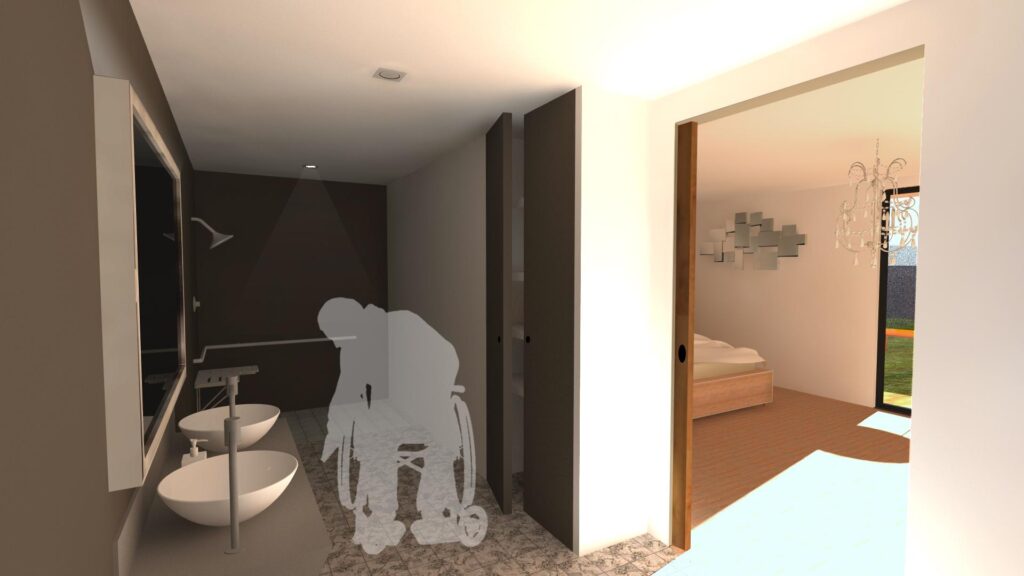 Le projet concerne un couple avec une personne en situation de mobilité réduite, il a fallu adapter une suite au RDC pour permettre une indépendance totale.
