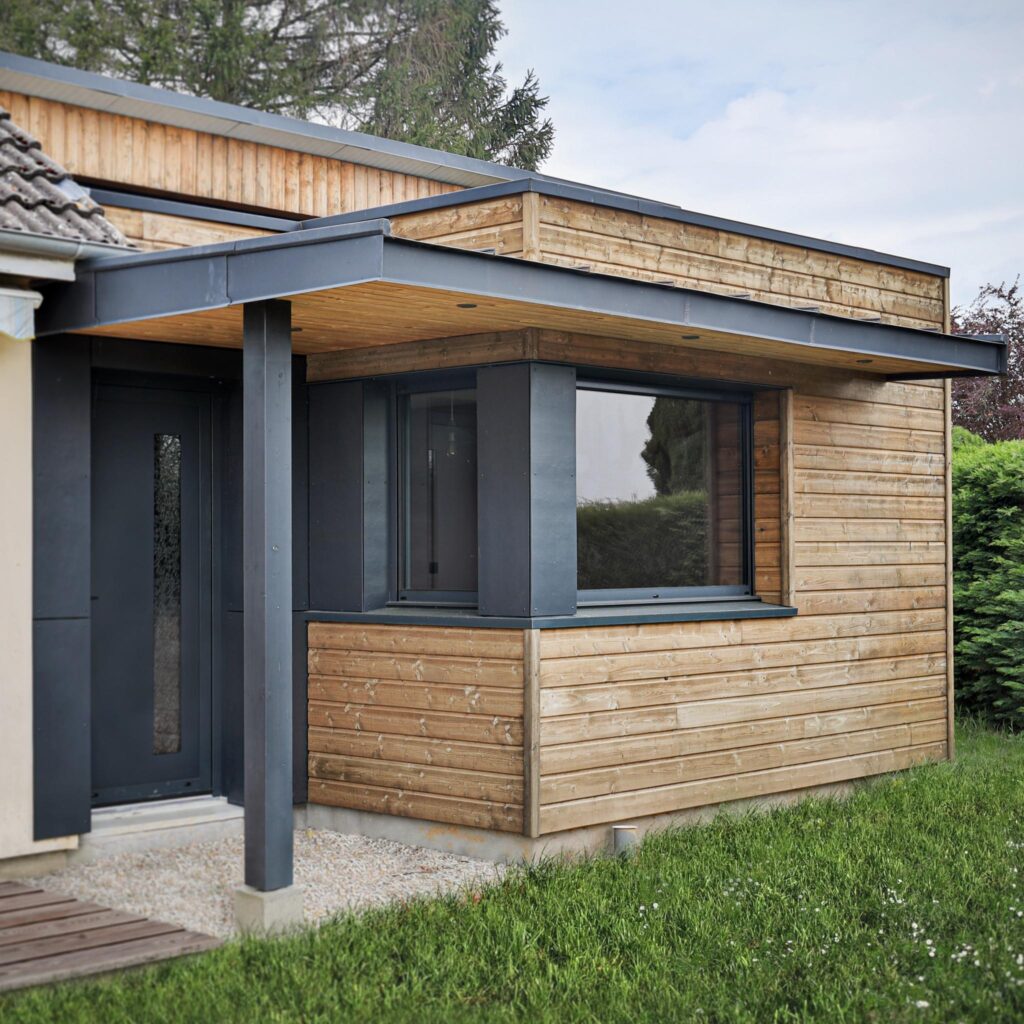 Prenant place sur une maison pavillonnaire traditionnelle, cette extension devait concilier la contrainte spatiale de la parcelle et l’agrandissement des volumes existants.