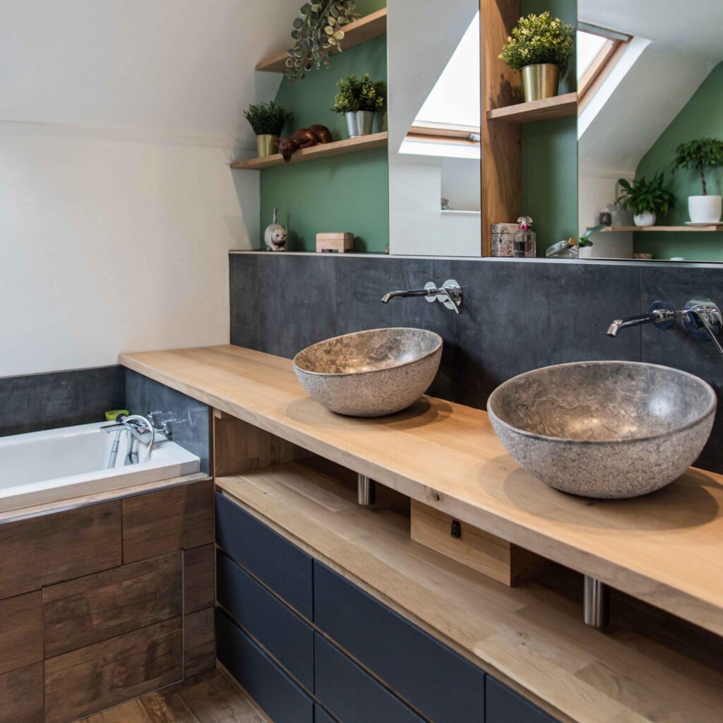 Rénovation totale d’une salle de bains située dans une maison pavillonnaire des années 80. L’ajout à la pièce d’une douche en plus de la baignoire était une des priorités pour les clients.