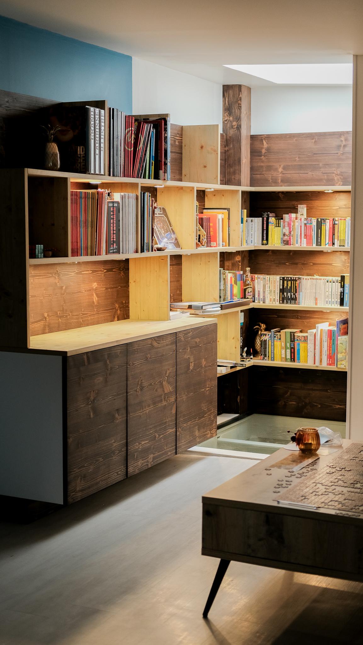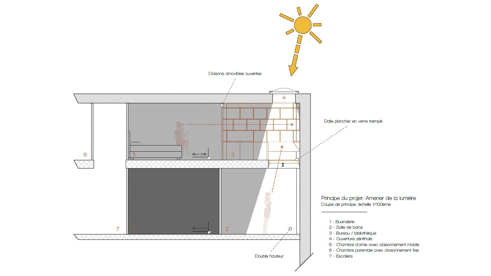 L’aménagement intérieur de cette maison de ville située à Bonsecours a donné place à un principe architectural singulier. En effet, le choix à été fait de ramener de la lumière depuis la toiture afin d’éclairer un bureau / bibliothèque et dans son prolongement une chambre d’amis.