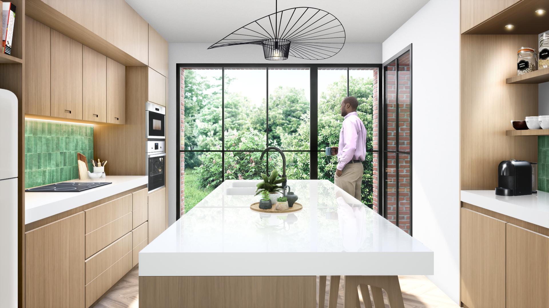 Située dans un quartier résidentiel avec du jardin en partie avant et en partie arrière, l’objectif était d’ouvrir la cuisine située dans l’extension vers un petit jardin arrière sans vis-à-vis.