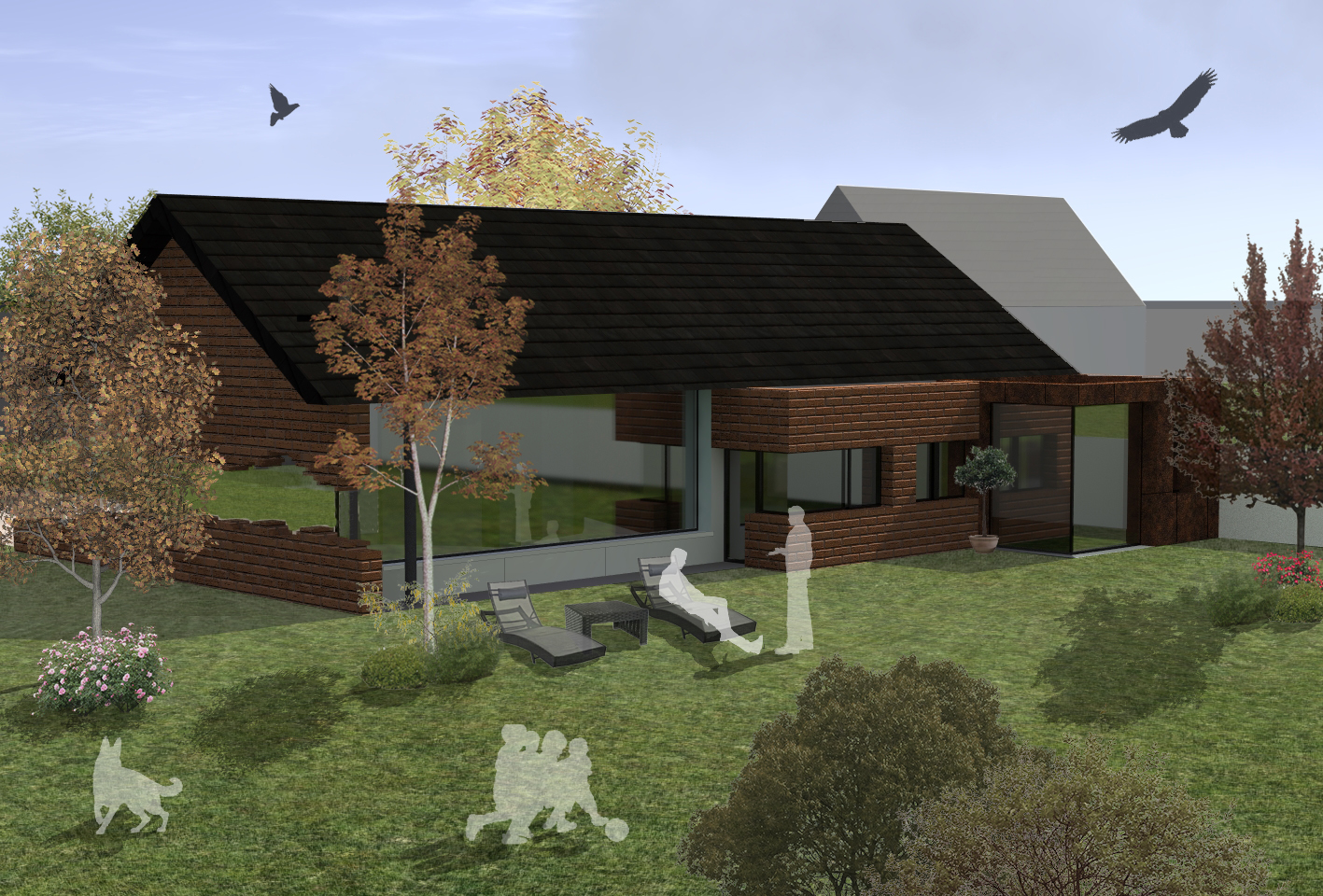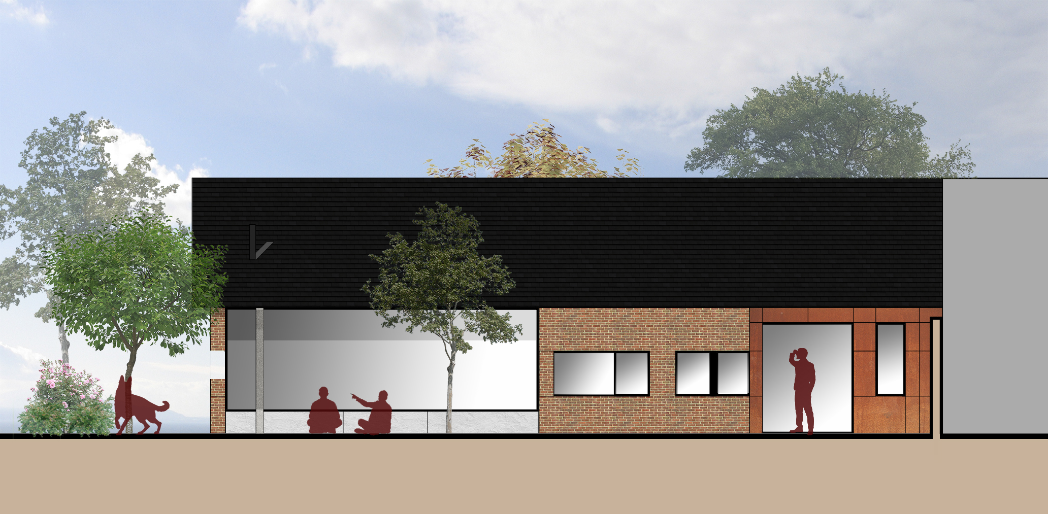 Deux blocs principaux sont mis en œuvre, un premier bloc en acier Corten dans le prolongement de l’annexe existante qui semble se fondre dans celui-ci. Le deuxième possède des décrochés et englobe la plus grande partie du programme. Cette seconde partie est regroupée sous un grand toit de forme plus traditionnel. N’ayant aucun vis à vis, les ouvertures sont très grandes ce qui permet un grand apport de lumière naturelle et un contact plus prononcé avec la nature.