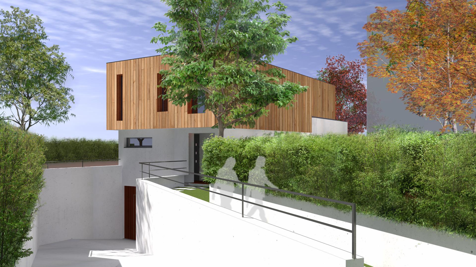 L’idée d’avoir un socle entièrement bétonné et un volume supérieur plus léger avec un bardage bois. La plupart des ouvertures se trouvent vers l’Ouest, permettant un apport suffisant de lumière et des vues vers le jardin.