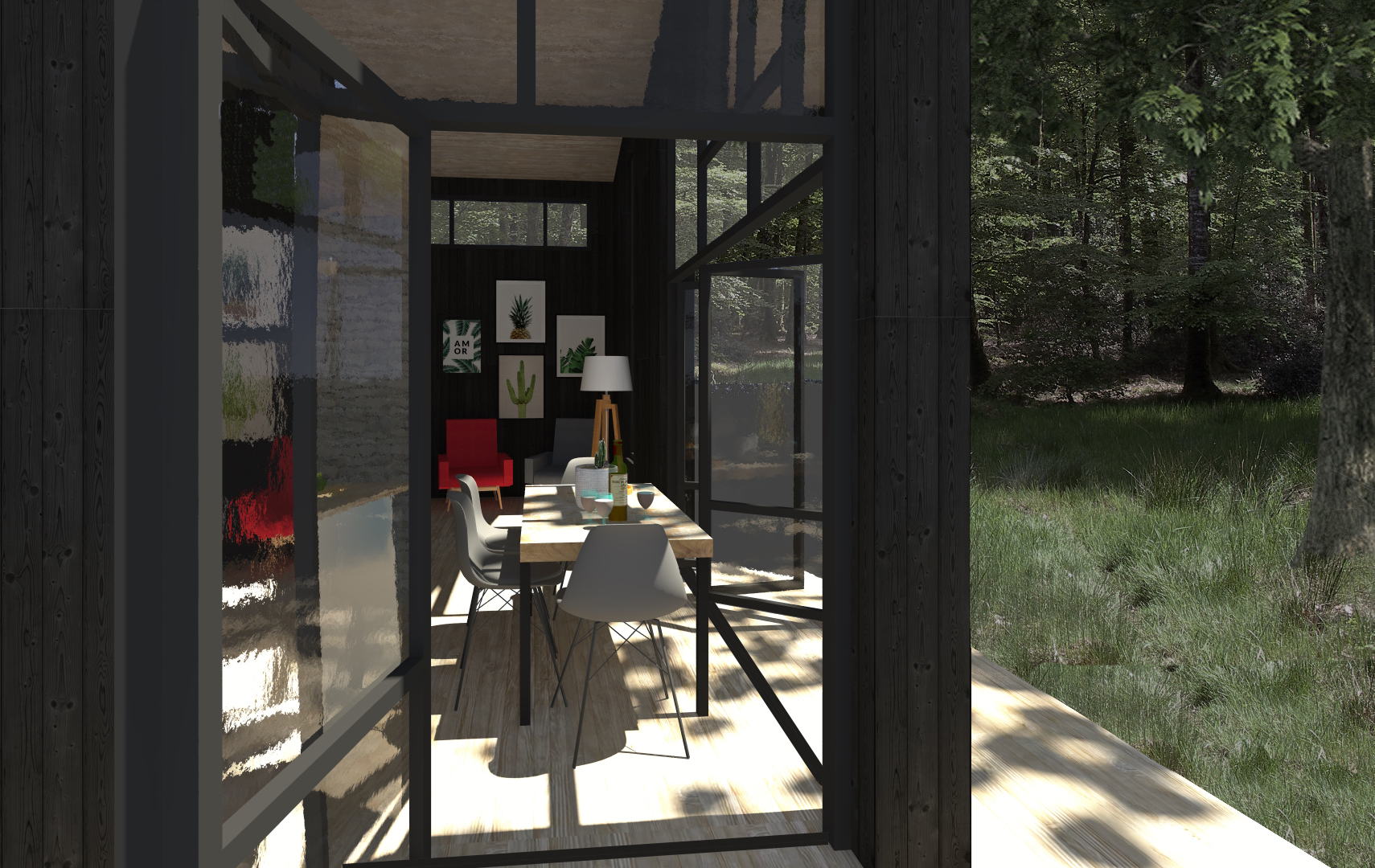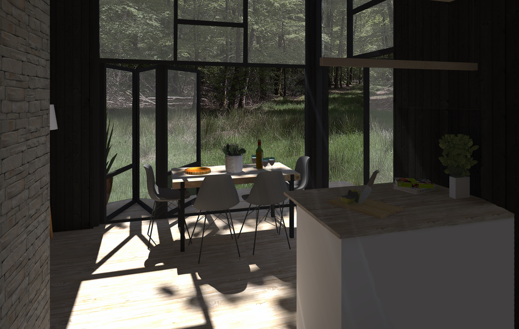 Les demandeurs souhaitaient disposer d’un pied-à-terre sur ce terrain. Les conditions étant idéales avec une rivière passant non loin de là, de la végétation tout autour et surtout aucun vis-à-vis. Il a fallu imaginer une architecture en dialogue avec la nature avoisinante.