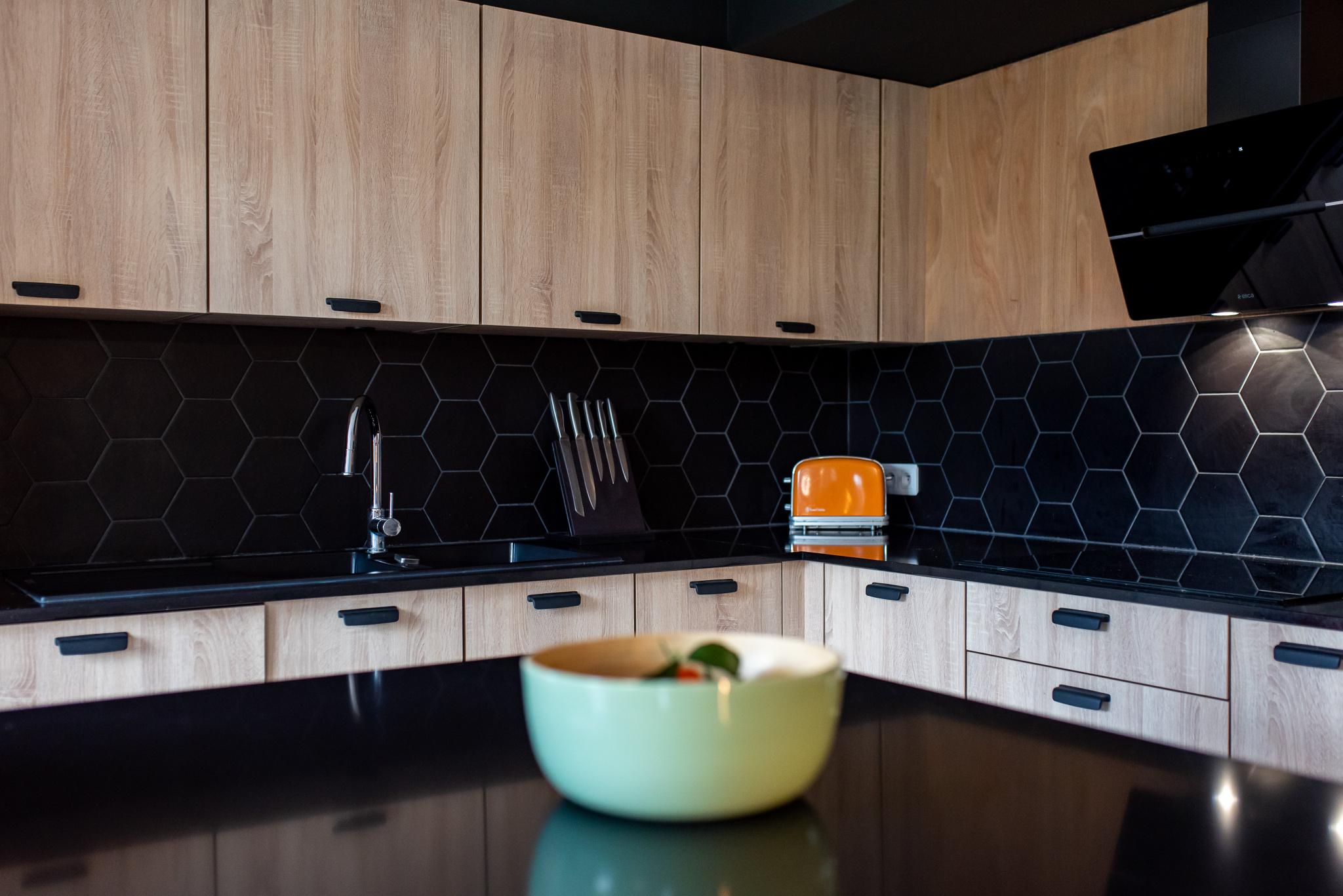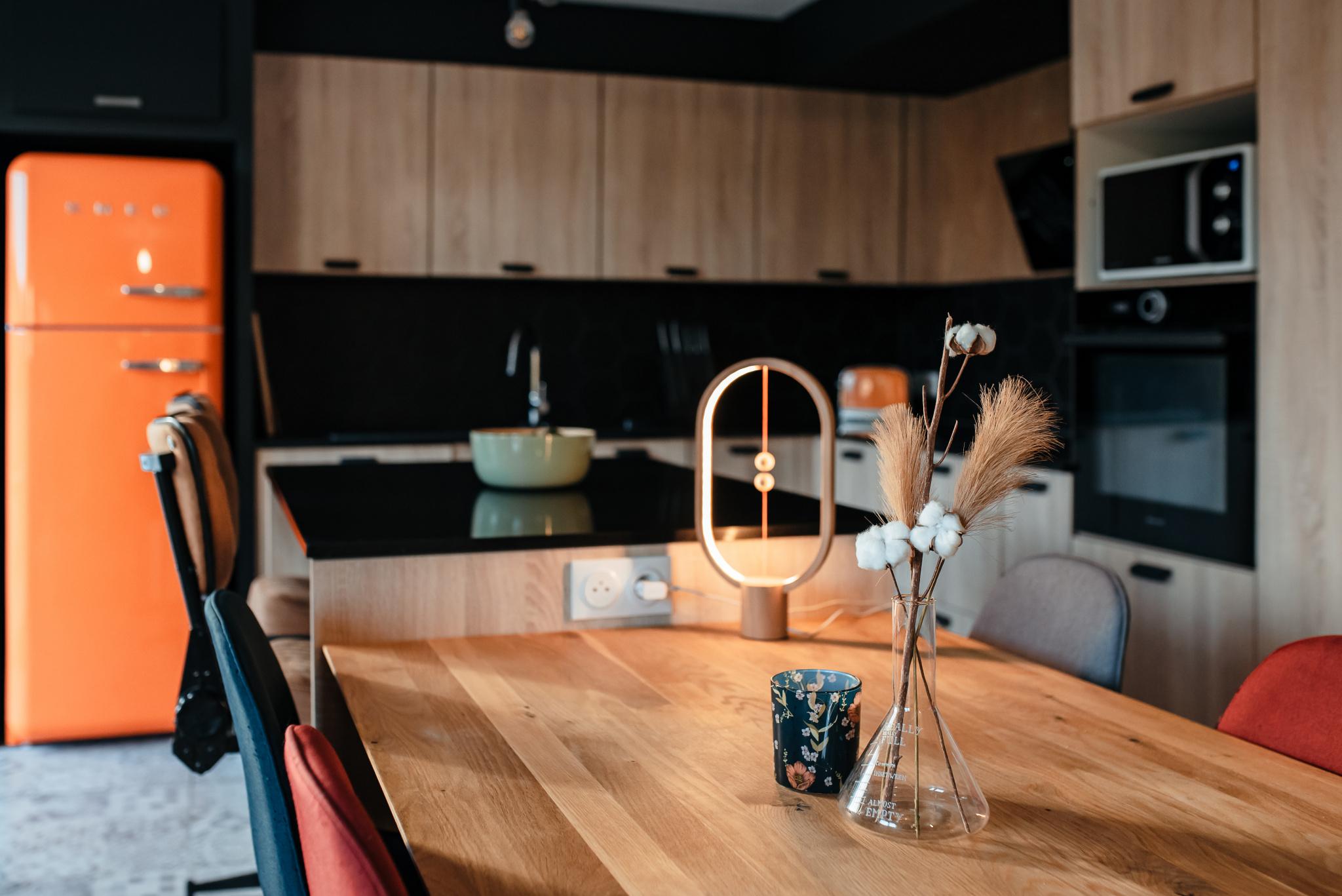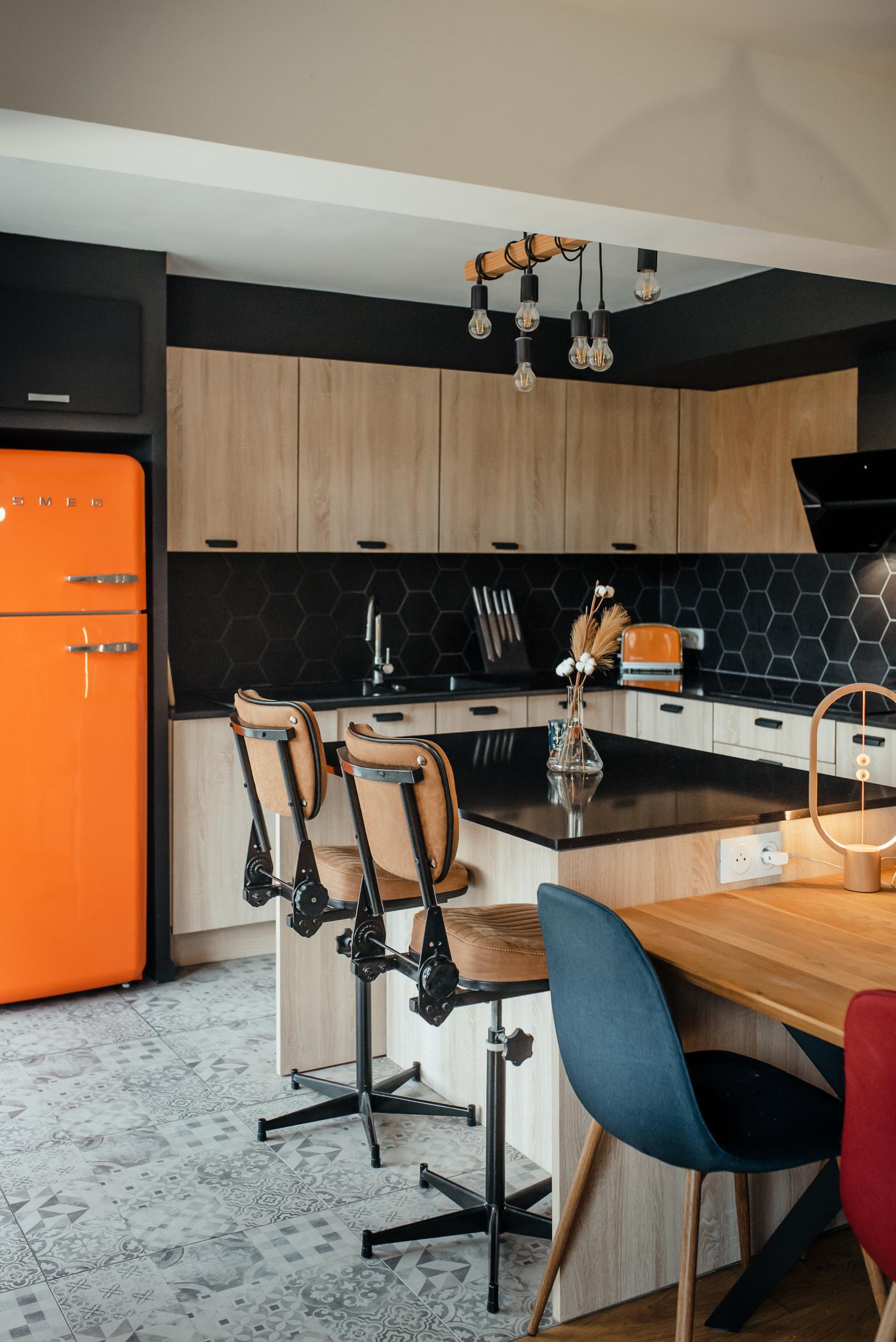 La conception de la cuisine sur mesure à été pensée par rapport aux clients qui souhaitent avec une grande cuisine donnant sur le salon séjour mais avec une séparation possible dans l’avenir à l’aide d’une verrière par exemple. Le dessin de cette cuisine devait être sobre mais également avoir quelques touches de couleur.